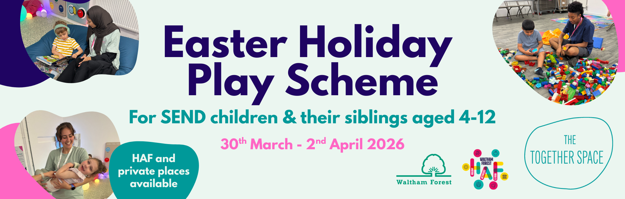 HAF BOOKINGS: If you live in Waltham Forest and your child receives benefit-related free schools meals then you can book a free place on the scheme via the Eequ Website HERE. The council will determine if you are eligible and will approve your booking. HAF places are for four hours per day only (9am-1pm). Extended hours are available on a private basis until 3pm, at a cost of £20ph. If you would like to discuss extended hours please email hello@thetogetherspace.co.uk